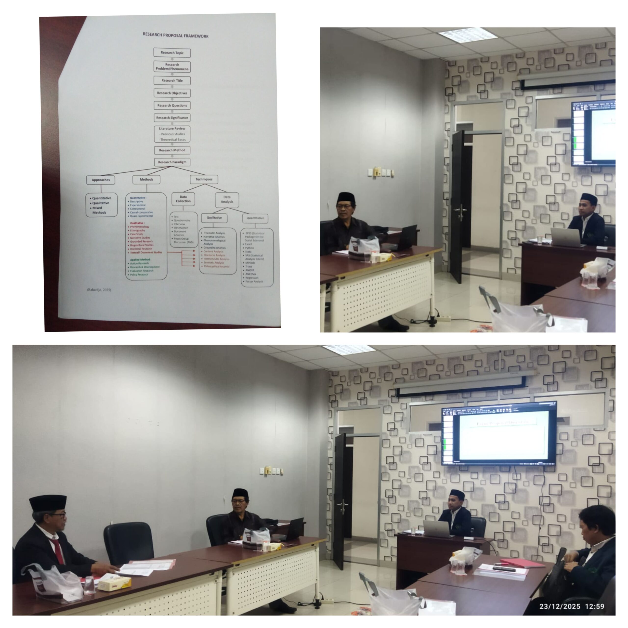 Ujian proposal tersebut menghadirkan Prof. Dr. Mudjia Rahardjo, Guru Besar Bidang Sosiolinguistik, sebagai Penguji Utama. Dalam forum akademik ini, Prof. Mudjia Rahardjo memberikan catatan metodologis dan epistemologis yang penting, dengan merujuk pada kerangka Research Proposal Framework yang menegaskan bahwa penelitian doktoral harus dibangun secara runtut mulai dari penajaman topik, perumusan problem epistemik, landasan teori, paradigma penelitian, hingga ketepatan metode dan teknik analisis. Menurutnya, proposal doktoral tidak boleh berhenti pada deskripsi atau perbandingan konsep, melainkan harus diarahkan pada penciptaan makna dan kontribusi teoretik baru. Oleh sebab itu, kata Beliau lebih lanjut, kajian disertasi minimal memiliki 3 (tiga) variable. Prof. Mudjia juga menegaskan bahwa Paradigma yang sesuai dengan kebutuhan di Pascasarjana dan sesai dengan pola yang dkembangkan adalah Paradigma Postpositivism.